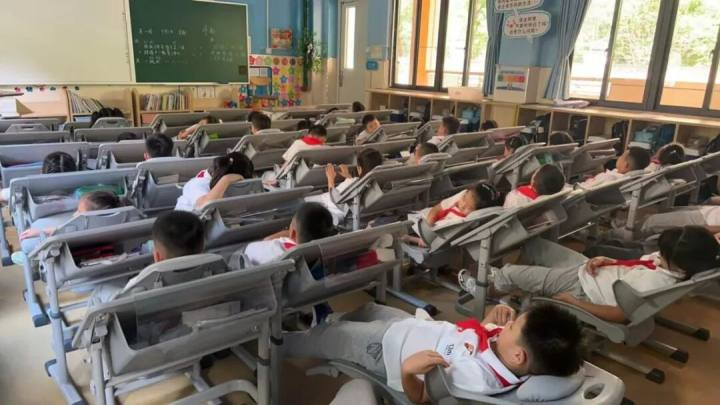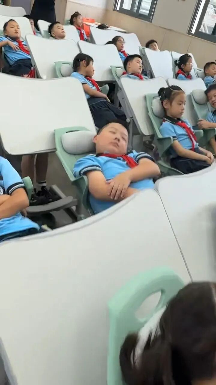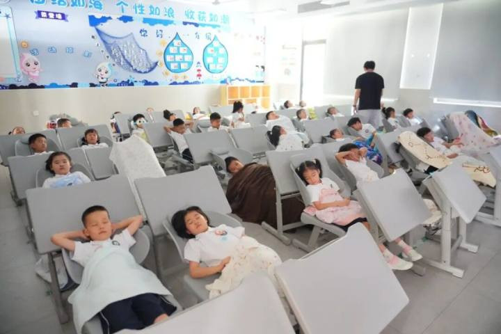 比如杭州市澎博小学新一年级也采购了新桌椅,但并不是躺睡椅。因为学校从上个学期综合考虑场地、成本、舒适度等因素,尝试推出了“躺平午睡”——让学生在教室里用折叠睡垫配套睡袋的形式午睡。