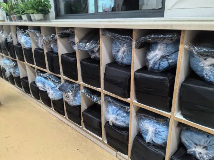学校定制了睡垫和睡袋,睡垫折叠起来是一个63×13×13厘米的长方体,可以收纳在书包柜里,展开后长180厘米、宽63厘米、厚3厘米,足够躺平一个小学生。
