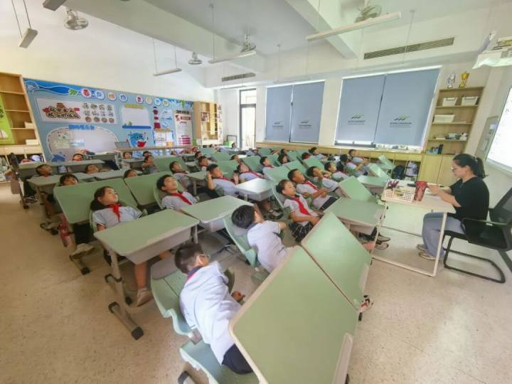 “今天孩子们刚去选好了躺睡的位置,个个都很兴奋。一年级的孩子是换了躺睡椅,不用离开教室,原地拉开椅子就能躺睡。”桃源小学校长吴丹娜说。